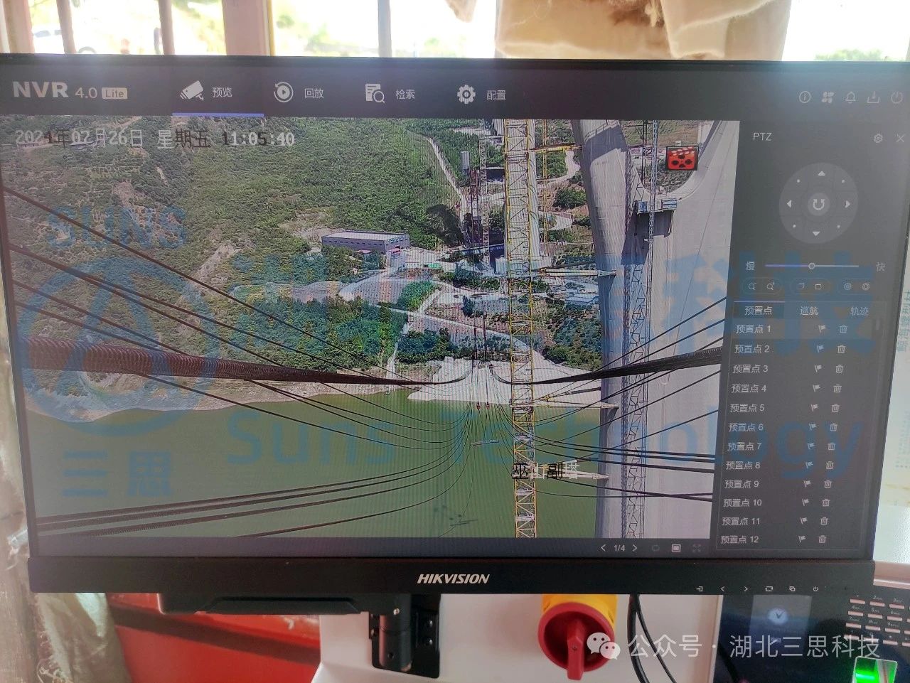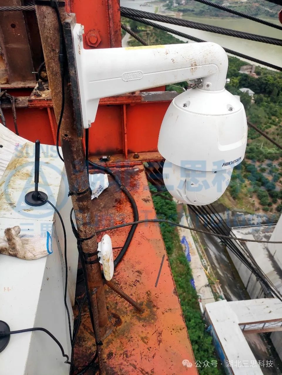 現(xiàn)場多臺槍機(jī)分別安裝在卷揚(yáng)平臺附近,監(jiān)視卷揚(yáng)的工作情況;兩個(gè)塔頂 各安裝多個(gè)球形攝像機(jī)用于鳥瞰纜索吊區(qū)域施工情況。