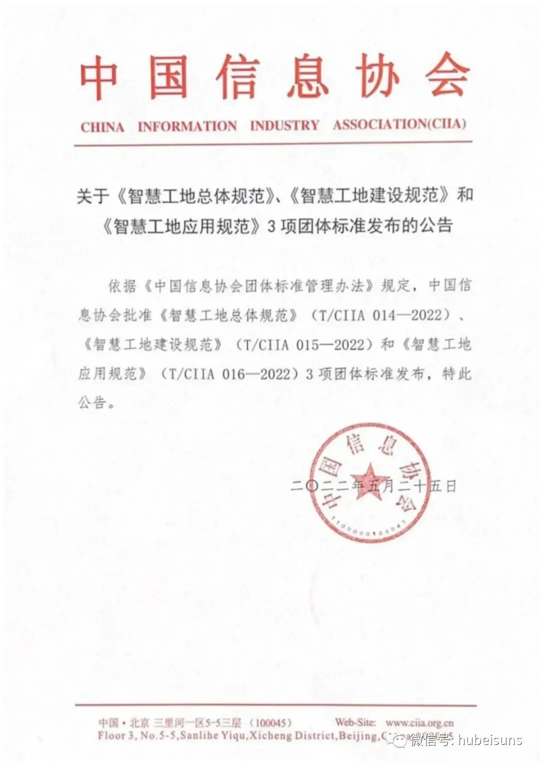 2022年5月25日,由湖北三思科技股份有限公司參與起草的《智慧工地建設規(guī)范》《智慧工地總體規(guī)范》《智慧工地應用規(guī)范》三項團體標準經中國信息協會批準正式發(fā)布!
