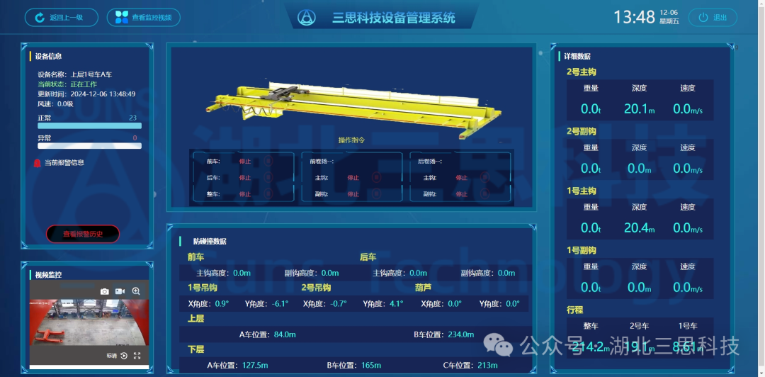 將該項目10臺橋機的運行狀態(tài)和視頻監(jiān)控畫面等信息,通過指定的協(xié)議接口,傳送到云系統(tǒng),可通過云查看任意一臺起重機的工作狀態(tài),實現(xiàn)設(shè)備的遠程監(jiān)控功能。并基于本地安全監(jiān)控CMS系統(tǒng),通過安裝一系列檢測傳感器、傳輸模塊等硬件,現(xiàn)上、下兩層橋機的防碰撞以及防止吊鉤歪拉斜吊的控制,提高廠房橋機的智能化程度。